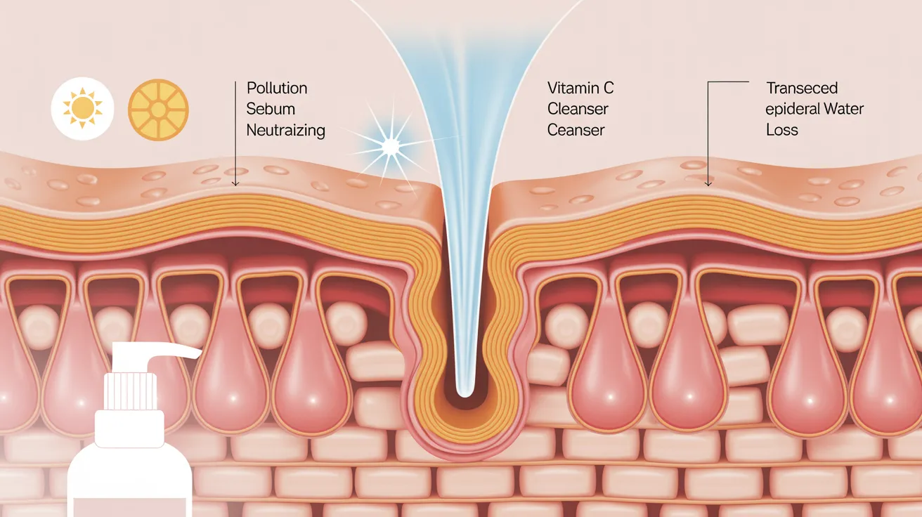 Apply a vitamin C cleanser to neutralize pollution- and UV-driven ROS, lift sebum and sunscreen, and increase brightness while protecting barrier lipids. Opt for stable derivatives (MAP, sodium ascorbyl phosphate, MAP), mild surfactants, glycerin, and ceramides; avoid harsh sulfates, strong AHAs, benzoyl peroxide, and copper peptides. Work on damp skin 30 to 60 seconds with lukewarm water, then use vitamin C serum, humectants, and SPF 30+. Choose gel vs cream based on skin type; monitor stinging and decrease frequency. Follow these tips to optimize results.